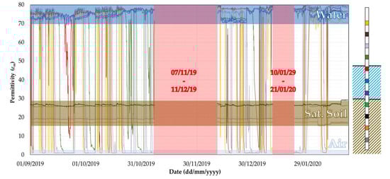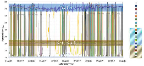 Figure 17 shows the sensors readings collected by probe P2. According to the different values of permittivity shown in Figure 7, three bands can be identified, associated with the permittivity of water (εm = 70–80), saturated soil (εm = 20–27) and air (εm = 1).