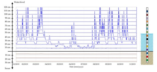 The data obtained by the probe P2 are supported by the actual measurement of scour in the vicinity of the steel tube and immediately downstream to it. Five measurements provided the same value of scour depth (i.e., 30 cm). A measurement was taken upstream from the tube, just over the scaffolding, and 20 cm of scour was recorded. The recorded scour might be the result of the turbulence of water around the steel pipe, since a circular tube inserted into the riverbed can induce local scour depths up to 2.5 times its diameter []. The diameter of the tube is 139 mm, which therefore may lead to a scour depth of 35 cm. However, this pipe-induced scour does not invalidate the obtained results, and in fact, it has confirmed the probe’s capacity to detect scour.