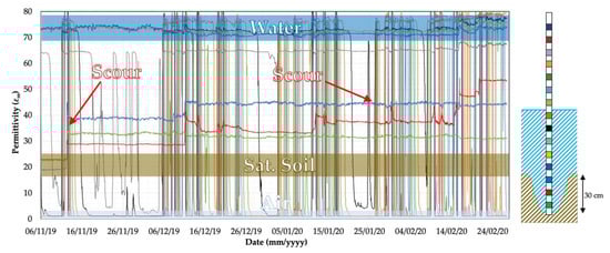 The significant dissimilarity in bulk permittivity before, upon, and post scouring is used to detect scour and bed material deposition processes surrounding the foundations. An example of the time history of the permittivity values before, during and after a scouring process is shown in Figure 7. It can also be observed that the pre-scour and post-scour conditions correspond to quite different permittivity values, which is useful to identify whether the scour hole has been refilled.