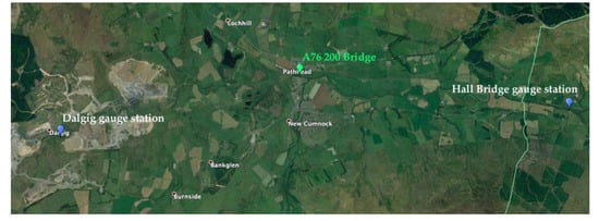 Data concerning the maximum daily value of river stage provided by the Scottish Environmental Protection Agency (SEPA) show a peak in the water level of the river during the night before the 12th November, which could have caused the scour event registered by probe P2. In particular, the gauging station located in Dalgig (upstream to the A76 200 bridge, see Figure 21) registered a value of water level equal to 1.883 m at the 3:15 am of the 12th November 2019, as shown in Figure 22a. The gauging station located in Hall Bridge (downstream to the A76 200 bridge, see Figure 21) registered a peak value of water level equal to 1.667 m at the 6:45 am of the 12th November 2019, as shown in Figure 22b. Both values are the maximum values registered by the gauging stations since March 2019, as can be seen from the graph in Figure 22a,b. Furthermore, the water levels recorded by the two gauging stations have been exceeded only ten times at Dalgig and 16 times at Hall bridge in the last six years.