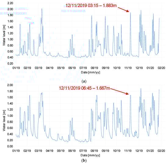 (a) Water level time-history at Dalgig station; (b) and Hall Bridge station from Jan. 2019.