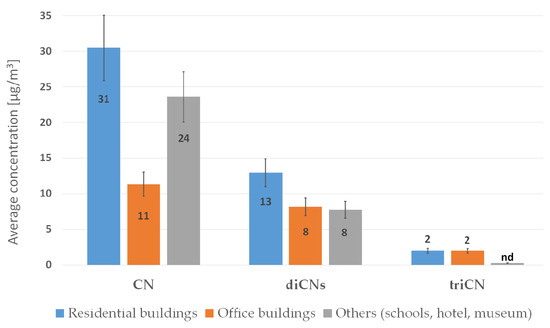 The presence of naphthalene and CN compounds in measurements of air quality indicates contamination with tar products and impregnants based on tar products, which was confirmed by the results of material tests measured in these rooms (Section 3.3). Naphthalene was identified in the air of residential buildings at all investigated points (12/12), in office buildings at 17 out of 24 points, and in public buildings (schools, hotel, museum) at 16 out of 18 points. In turn, CNs were identified in residential buildings at 10 out of 12 points, while in office and public buildings at all investigated points.