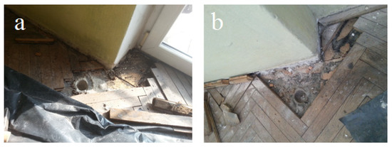 Floor material sampling points in two different (a) and (b) residential buildings (photos taken by the authors).