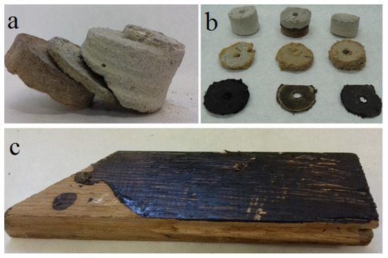 Samples of materials from floor layers in residential buildings: (a) concrete floor slab + tar adhesive + soft insulating fiberboard from a single and (b) different sampling points; (c) wooden construction covered by tar adhesive (photos taken by the authors).