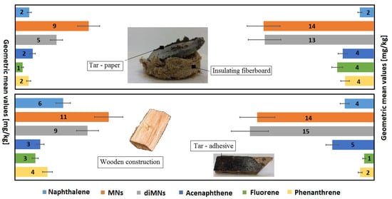 The following paragraph describes in detail 4 specific cases out of 21 collected in Table 4. Xylamite-impregnated porous fiberboard applied under floors in one of the public building emitted methylnaphthalenes up to 244 mg/kg, dimethylnaphthalenes up to 732 mg/kg, acenaphthene up to 484 mg/kg, and dibenzofuran up to 263 mg/kg. Wooden roof elements conserved with creosote emitted methylnaphthalenes in the amount up to 244 mg/kg, dimethylnaphthalenes to 377 mg/kg, acenaphthene to 270 mg/kg, fluorene to 240 mg/kg, phenanthrene to 619 mg/kg, anthracene to 541 mg/kg, phenol up to 31 mg/kg, xylenols up to 52 mg/kg, benzothiophene up to 13 mg/kg, and quinoline up to 67 mg/kg. Wood samples from the roof structure in another residential building emitted methylnaphthalenes in an amount up to 258 mg/kg, dimethylnaphthalene up to 132 mg/kg, acenaphthene up to 100 mg/kg, cresols up to 92 mg/kg, xylenols up to 146 mg/kg, benzothiophene up to 3 mg/kg, and 2-methylobiphenyl up to 26 mg/kg. In turn, tar paper used as underfloor insulation emitted naphthalene in an amount up to 25 mg/kg, methylnaphthalenes up to 65 mg/kg, dimethylnaphthalenes up to 84 mg/kg, acenaphthene up to 37 mg/kg, fluorene up to 16 mg/kg, phenanthrene up to 8 mg/kg, dibenzofuran up to 24 mg/kg, cresols up to 41 mg/kg, and xylenols up to 72 mg/kg.