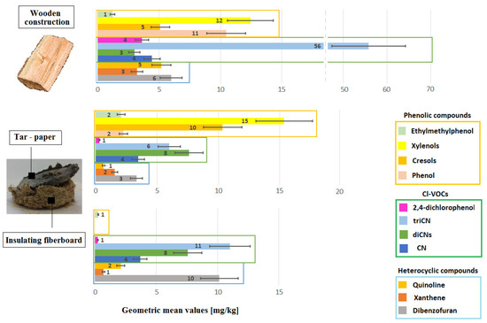 The source of emission of PAHs was bituminous materials containing tar insulation paper, tar adhesives, and wood preservatives—creosote and products under the trade name Xylamite. The source of CN and CP emissions was also Xylamite. If the insulation paper or tar adhesive emitted Cl-VOCs, this was the result of the incorporation of Xylamite, a porous fiberboard or wood close to the material, as a preservative.