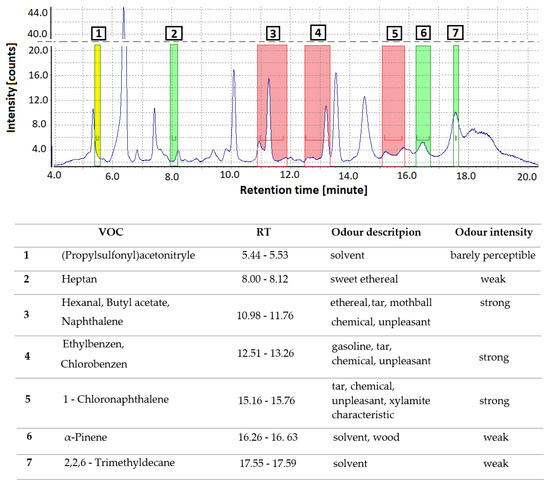 GC/MS-O was used to identify seven odor-active compounds in the Xylamite-impregnated wooden floor samples (Figure 7). The GC-MS/O methodology allows the establishment of a correlation between the chemical nature and concentration of specific odor compounds and the human perception of smell. Each of the perceived compounds was identified based on the retention time, reference compounds, and by searching the NIST 2011 mass spectral database. Odorants were described by four panelists, in their own words, according to their previous experience. No anosmia was reported. The experts also evaluated the odor intensity scale, with naphthalene, chlorobenzene, and 1-CN being the odorants perceived to have the strongest intensity. Naphthalene had an ethereal, tar, mothball, and strong chemical smell; chlorobenzene had a gasoline and tar smell; whereas 1-CN had a strong, unpleasant, tar, chemical, and Xylamite-characteristic odor. Heptane (sweet ethereal), α-pinene (solvent, wood), and 2,2,6-trimethyldecane (solvent) were odor-active compounds with a weak intensity.