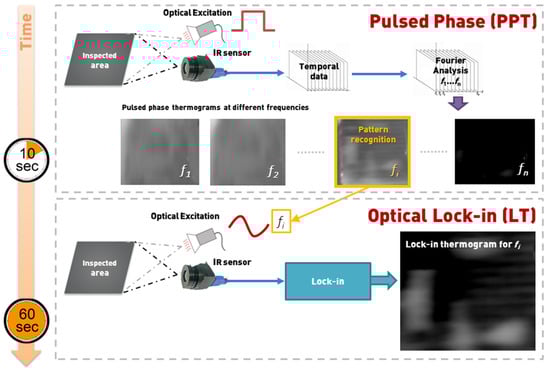The principle of operation of the two-phase PPI-LT strategy for fast, accurate, and qualitative damage detection in aircraft components is schematized in Figure 1. In the initial phase, the area under investigation is inspected under typical PPT wherein the heating and cooling sequence of the material under optical excitation of a square thermal pulse of variable excitation frequencies, f1, f2,…, fn, is captured by the IR sensor and the temporal variation of collected thermal waves is converted by fast Fourier transform (FFT), to frequency variation. This provides a series of phase and amplitude image sets (thermograms) relating to the geometric and dilatational characteristics of the defect. Pattern recognition software is employed on the set of pulsed phase phase-domain thermograms collected at different excitation frequencies f1, f2,…, fn, for the rapid identification of the optimal frequency, fi, for clearest defect depiction, based on optimum contrast features in the thermograms. This initial part, of identification of the optimal frequency fi for assessing the defect, lasts approximately 10 Sec. For a series of thermographic acquisitions on the same type of material, hence the same thermal dissipation properties, the frequency sweep phase can be omitted. In the second phase of the PPI-LT strategy, the identified fi is set as the frequency of sinusoidal excitation of the same area, under lock-in configuration for a longer period, to fully assess the dilatational characteristics of the damage. The lock-in thermograph collected in this stage is the sharpest and clearest possible IRT representation of the defect and contains the maximum information about damage shape and dimensions. The lock-in phase endures for approximately 50 s, depending on the value of the optimal frequency fi. In essence, the lock-in phase is “informed” of the optimal frequency it should operate by the pulsed phase. Overall, the synergy of PPT and LT leads to the fast and accurate characterization of damage at all subsurface depths penetrable by IRT. It must be noted that no limitation is imposed on the type of excitation source, which can include lamps, microwaves, ultrasounds, or Eddy currents, provided the source is powerful enough for the clear thermographic representation of the defects [34,49].