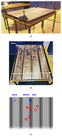 Composite flat-panel reinforced with T-stringers (a) front and (b) rear view of the panel and (c) schematic index of locations of barely visible impact damages.