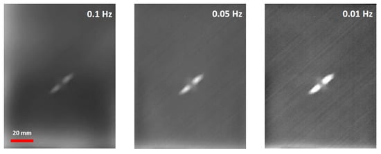 The initial phase of the PPI-LT thermographic strategy involved identification, under PP configuration, of the optimal frequency for the assessment of the damage by analyzing phase-domain thermographic data collected at varying frequencies. Figure 4 demonstrates three phase-domain thermograms of the same impact damage, collected with three different PP frequencies within the range of interest. In practical terms, after interrogating composite areas containing inflicted damages with the frequency sweep algorithm, automatic image analysis of phase-domain thermograms in the dataset pursued, based on the highest contrast criteria for identification of the optimal frequency fi associated with the clearest depiction of damage. For the material under investigation, the value for this frequency, fi, was selected automatically and was found independent of the number of plies in the specimen. The invariance of fi to specimen thickness indicates that the frequency is primarily material- and not geometry-intrinsic; this can be rationalized upon two factors. First, the uniform nature of specimens made for the same matrix and fibers, and, second, the uniform dilatational characteristics of impacts produced by the same impactor creating surface dents less than 0.3 mm. It is anticipated that the optimal frequency would differentiate in the case that a different material was to be interrogated.
