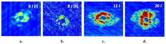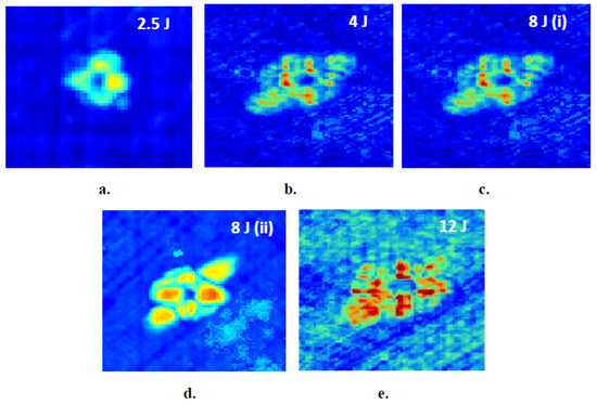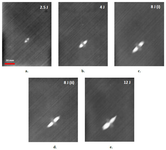 Thermographic assessment of impact damage in thin, 9-layer composite laminates for different levels of impact energies. (a) 2.5 J, (b) 4 J, (c) 8 J, (d) 8 J, (e) 12 J.