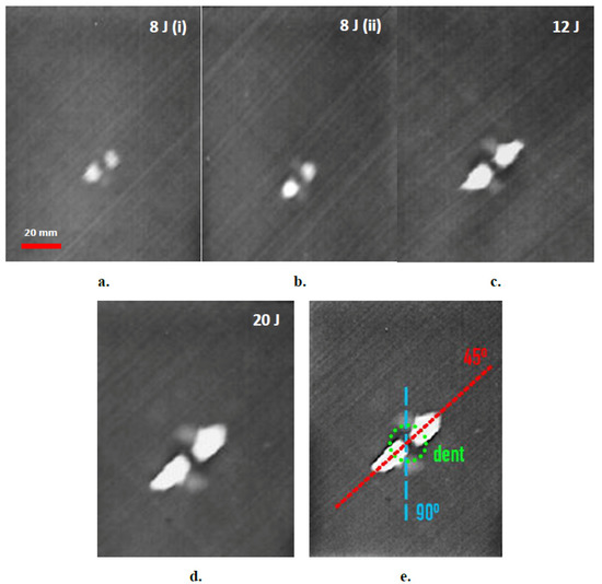 The effectiveness of the developed approach in capturing impact damages in the thin (~1.65 mm) and thick (~3.8 mm) aircraft-grade laminated specimens is demonstrated in the phase-domain thermograms of Figure 5 and Figure 6, respectively. The amount of impact energy used for each damage is included in each thermograph, while the scale bar of the first image in each subset, is common for the rest. In the thermograms, the damage is clearly depicted to vary in magnitude and size with impact energy. It is observed that the most prominent part of the thermographically distinguishable damage is the bright area along the +45° direction corresponding to fiber delamination on outer laminas, which lie on the particular orientation and were the ones most severely affected by the impact. In some cases, damage in deeper laminas is also distinguishable, albeit of smaller extent, such as damage in −45° laminas in the subset graphs of Figure 5, or damage in the 90° laminas in the thicker specimens in Figure 6. The impact dent itself, although barely visible by the naked eye, is clearly distinguishable in thermograms Figure 6c,d, as a round darker area in the middle of the damage. Figure 6e provides a schematic index of thermographically distinguishable orientations.