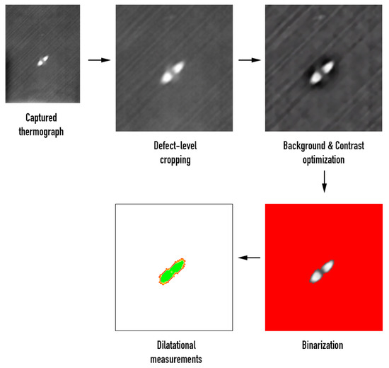 Image analysis on the collected phase-domain thermograms provided dilatational characteristics of the damage. Calculation of damage area and size involved a series of analytical processes, the most important of which were background correction and binarization of the image. Damage area was evaluated after transformation of the damage area, in the binary image, into a shape and calculating the number of pixels therein using the image-specific pixel-to-length conversion factor, which was introduced by aid of the scale bar. Figure 9 provides a schematic overview of the sequential processing involved in the calculation of the dilatational aspects of damage. It is therein observed that, following background correction, a dull dark halo is distinguishable around the defect. As has also been documented in previous studies [51,52,53], this zone is associated with delamination near the back face of the material, that the infrared sensor cannot fully interrogate. The more powerful—but much slower—C-scan images, Figure 7 and Figure 8, interrogate the full material thickness and validate the existence of such a round damage zone. The zone was not accounted for by the constrast-based binarization method because the information obtained by IRT from the back surface of the composite was masked by the very bright/intense damage information from the top laminas.