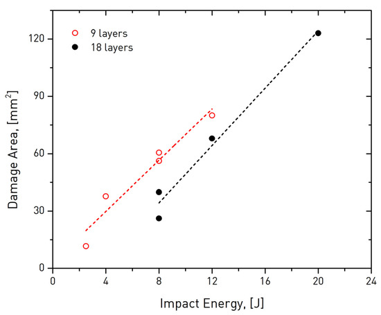 Table 3 summarizes the findings of the analysis in terms of area and perimeter of damage; the primer is plotted as a function of impact energy level in Figure 10. Therein, it is primarily observed that the extent of damage appeared to be higher in thinned specimens, a behavior that is anticipated as damage expands laterally in these specimens due to the lower material volume in the transverse direction. In 18-layer laminates, the impact wave was allowed to travel more through the (thicker) material and cause damage in larger depths, as also evidenced in the thermograms of Figure 6. The linear approximations to the data exhibited similar slopes of 6.7 and 7.5 for thin and thick specimens, respectively. This finding suggests that the rate of damage accumulation was another material- rather than geometry-intrinsic parameter.