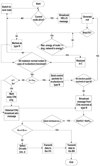 LEACH [47,48], is a primary known clustering based protocol. The primary goal of LEACH is to introduce local cluster based communication by reducing the global transformation of data packets. A threshold value is considered and an arbitrary number is generated by all the nodes upon which selection of CHs depends. In the case that the created arbitrary number is less when comparing it to the value of the considered threshold, at that moment the particular node is nominated as CH or vise versa. However, in this way, CHs are randomly selected due to which variation in size of clusters is introduced. These variations directly affect the node(s) energy level harshly and, thus, network lifetime decreases.