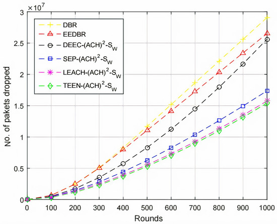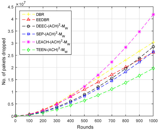 By comparing with other protocols, LEACH-(ACH) sends maximum packets to sink, hence, the packet dropped ratio is higher. In case of TEEN-(ACH), packets are sent to BS according to the threshold value, fewer packets are forwarded to BS; hence, less number of packets are dropped, as shown in Figure 11.
