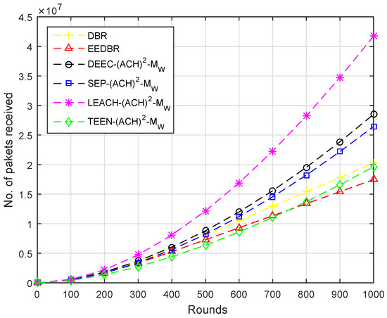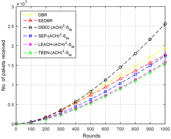 In Figure 5, DEEC-(ACH) performs well when comparing with other routing protocols. As DEEC-(ACH) is a multilevel heterogeneous routing protocol because of which nodes kept alive for longer duration and, thus, large number of packets are disseminated to the sink. In DBR and EEDBR, each node sends packets through various tracks to the sink that is why results in the maximum number of packets sent. In LEACH-(ACH), all nodes have the same initial energy; hence, nodes will die soon and fewer packets will arrive at the sink. In TEEN-(ACH), packets are transmitted on the basis of the soft and hard threshold, due to which less number of packets will hit the BS.