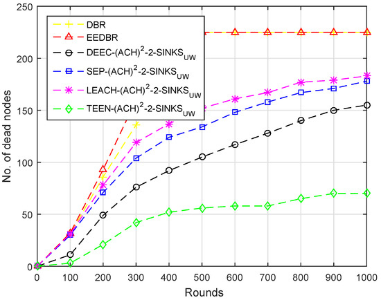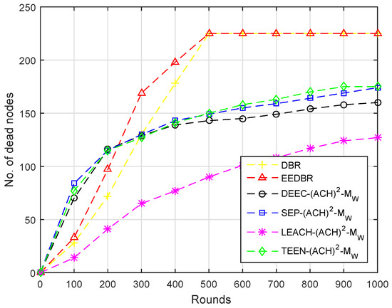 Due to multi-hop data forwarding, a maximum several nodes died in DBR and EEDBR, as shown in Figure 14. SEP- and DEEC- are heterogeneous routing protocols, thus nodes remain alive for a longer period. In TEEN-, less number of nodes die because nodes transmit data based on a threshold value.