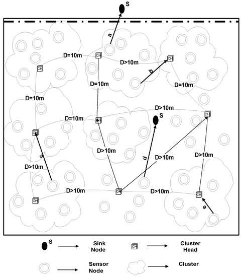 U-(ACH) is a clustering based routing protocol, where CHs are selected on the basis of remaining energy. The remaining energy needs to be examined in order to select CHs. Therefore, the nodes having superlative remaining power are preferred [57]. For the sake of reducing the load on CHs, the optimum number of clusters is selected that results in balanced cluster size. For this, a selection criterion is defined that depends upon the 10 m distance of a selected CH from other elected CH, as demonstrated in Figure 2. The reasoning behind the distance measure is to balance the load factor on each cluster. By doing so, many clusters would be equally loaded with the associated cluster members otherwise some clusters would have many associated cluster members while other clusters may be found under load. To avoid this controversy, the distance measure is considered in this study.