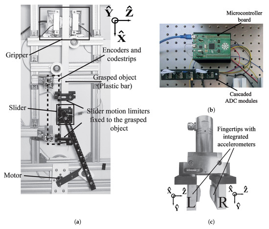 Experimental platform. (a) The front view of the experimental setup. (b) Data acquisition system consisting of microcontroller board and cascaded analog-to-digital converter (ADC) modules. (c) The gripper with its left (L) and right (R) fingertips with the accelerometers on the paddings.