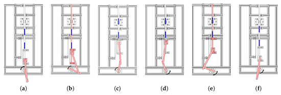 The states of the slip-slide system during one rotation of the motor. The motor is rotating counter-clockwise. Red shaded parts represent the moving objects. Blue arrows show the relative position of the grasped object in various states. The states are the following: (a) end of no-motion and start of sliding, (b) end of sliding and start of slippage, (c) end of slippage and start of no-motion, (d) end of no-motion and start of sliding, (e) end of sliding and start of slippage, and (f) end of slippage and start of sliding.