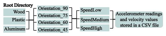 The data from each experiment were saved in a separate folder hierarchically ordered, as shown in Figure 4. The root directory contains three folders corresponding to three objects. Each of these folders has four directories corresponding to four orientations. Finally, we have three subfolders that store the data for different rotational speeds. Each folder contains a comma-separated values (csv) file with eight variables. The size of the dataset is 1.3 GB.