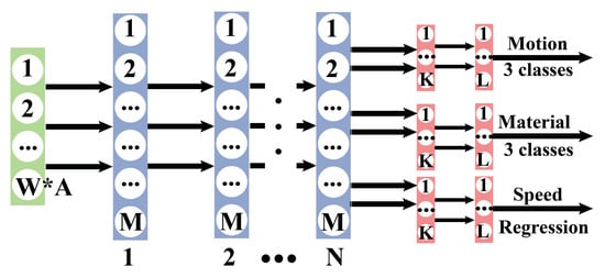 During training FNN models, we concatenated the channels into a single column vector. The classification and regression tasks shared N densely connected layers. N was varied from one to six. The number of common layer units, M, was varied from 128 to 4096. We utilized a grid search to identify the hyperparameters of the models. Figure 6 illustrates the topology of our FNN. We utilized two separate hidden layers for each classification and regression sub-problem.