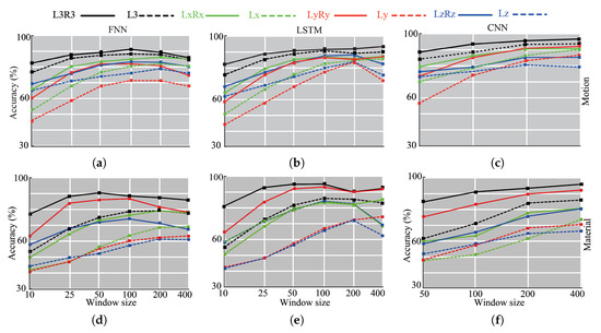 Presumably, the aforementioned classification tasks can be resolved using a small number of sensors. For instance, readings from both accelerometers might be redundant. Therefore, we tried various combinations of the accelerometers’ axes to assess these assumptions. Specifically, we had eight different settings: all six channels (L3R3), all channels of the left accelerometer (L3), x-axis of both accelerometers (LxRx), x-axis of the left accelerometer (Lx), y-axis of both accelerometers (LyRy), y-axis of the left accelerometer (Ly), z-axis of both accelerometers (LzRz), and z-axis of the left accelerometer (Lz).