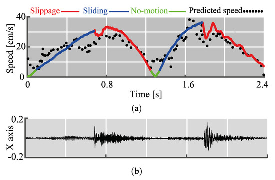 The results of CNN model for the speed estimation are visualized in Figure 9a and vibrations accompanying these motions are shown in Figure 9b. Overall, the estimated speed followed the real one. However, there were more fluctuations during sliding. Indeed, MSD for the sliding was 1.5 times larger (4.8 cm/s) than the average one. During no-motion, MSD was smaller (2.4 cm/s) since the speed is low (the maximum speed = 5 cm/s). The MSD loss value for slippage (MSE = 3.6 cm/s) was almost twice less than for sliding. This might be due to the difference in the magnitude of the sensed vibrations during these two motions.