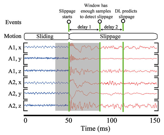 Figure 11 represents 150 ms time segment of accelerometer readings when slippage occurs at 50 ms. To detect this slippage event, a window should have sufficient number of slippage samples (delay 1). After that, DL models spend some time to execute computations, which is equal to the inference time (delay 2).