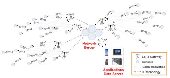 Moreover, the spreading factor has been modified from SF12, representing the most unfavorable case (with the sensor located at a great distance from the GW) to SF6 corresponding the situation in which the sensor is located at a short distance from the GW. For each analyzed SF, every spreading factor is taken into consideration as possible interference. Obviously, the maximum value is reached when all the other sensors communicate on the same SF as the one undergoing analysis; this situation is also what we refer to as the worst-case scenario. This is a pessimistic approach and represents the evaluation of a boundary situation which is, however, often met with during the practical implementations of the LoRa technology. Due to the fact that one of the main advantages of the LoRa technology consists in large communication distances of the order of tens of kilometers; the operators of these networks will choose an SF with the maximum value available and implicitly ensuring communication at long distances, from an incentive to minimize the number of gateways (e.g., because of cost) which serves a certain area.