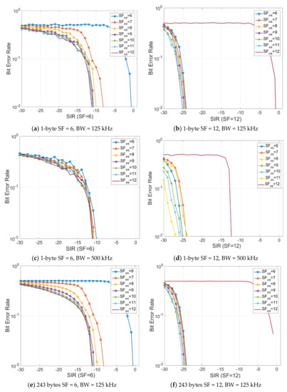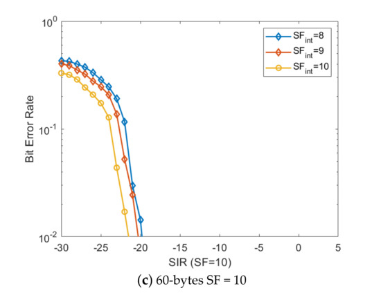 The modulated packet is then interfered in turn with a random LoRa packet modulated by a spreading factor, so that all possible variations are analyzed. The interfering packet is sent at random moments in time with an SIR (Signal-to-Interference Ratio) which increases by a 1 dB step starting from −30 dB. By implementing this mechanism, the BER (Bit Error Rate) characteristic can be determined, as a result of comparing later demodulated bits to initial modulated ones. It can be concluded that, the lower the spreading factor that interferes with the communication, the higher the SIR threshold necessary to obtain an admissible BER value. The model is implemented using MATLAB [27] environment and allows the modulation and demodulation of LoRa packets without any in-band noise from other interference sources.