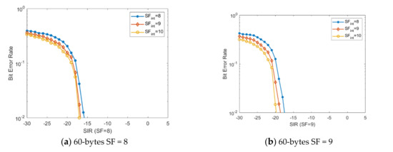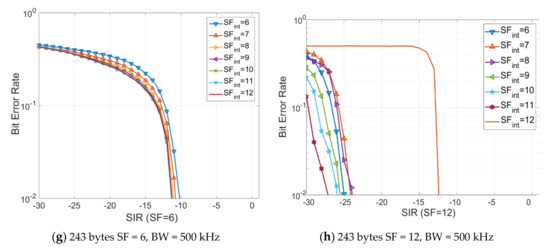 The SIR parameter has been chosen to evaluate performance as accurately as possible, considering the LoRa communication channel. One can observe that for an SIR value of approximative −1 dB, the BER value equals to about 70%. There is still the need to mention the fact that the most unfavorable case is analyzed when all sensors use the same SF12 spreading factor.