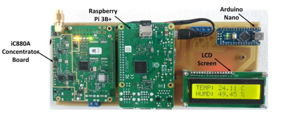 LoRaWAN gateway. The gateway integrates a Raspberry PI 3B+ and the iC880A concentrator that allows the simultaneous communication on eight channels (as stated in the LoRaWAN specifications).