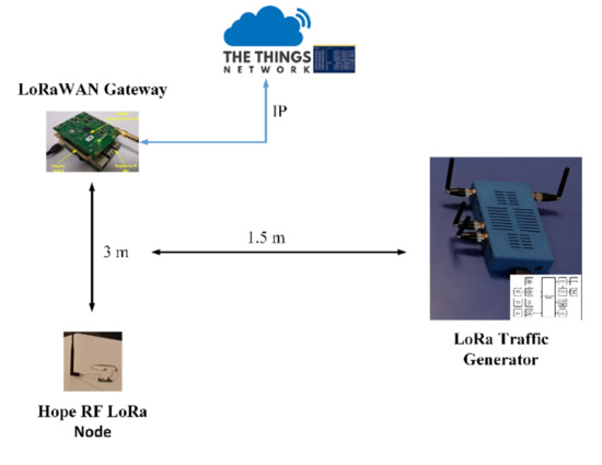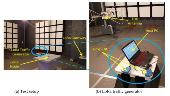 Figure 13 presents the performed evaluation scenario setup in the anechoic chamber. As previously stated, this includes the Hope RF LoRa node, the developed LoRa gateway that is connected to the TNN platform and the implemented SDR LoRa traffic generator.
