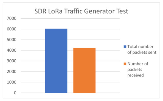 The LoRa traffic generator results are depicted in Figure 14. A total number of 6043 packets were sent on 868.3 MHz communication channel. Out of all the gathered results of the experiment, only approximately 4230 were received and recorded by the GW. We can conclude that approximately 30% were lost, due to collisions occurring at the receiving side. Upon closer inspection, it is revealed that the packets that have been lost are precisely the ones which have been sent at the exact same time and used the same SF notwithstanding payload dimensions.