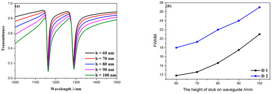 Successively, the structural parameters of stub on bus waveguide were investigated. The height of stub on bus waveguide h was set as 60, 70, 80, 90, 100 nm. It can be observed from Figure 8a that h had less influence on positions of dips but had remarkable effect on width of transmission spectra. Specifically, as h grew, the FWHM of D1 increased from 18 to 27 nm, the FWHM of D2 increased from 11.8 to 21 nm, which are shown in Figure 8b. The width of the stub on bus waveguide d was set as 50, 70, 90, 110, 130 nm. The variation of transmission spectra with change of d is depicted in Figure 8c. Similarly, when d grew, wavelengths of Fano resonance dips did not shift, the width of profile became broader. To be specific, as plotted in Figure 8d, the FWHM of D1 rose from 22 to 35 nm, the FWHM of D2 rose from 14.6 to 20.2 nm. In addition, transmittance at two dips slightly dropped with the growing of h and d. It can be concluded that smaller size of the stub on bus waveguide possesses narrower FWHM that leads to better optical resolution and FOM. Additionally, it can be found that the spectral width of Fano resonance largely depends on geometric parameters of the stub on bus waveguide, which acts as broadband mode. Furthermore, the stub on bus waveguide is always symmetric about centerline regardless of how h and d change. Therefore, the sizes of the stub on bus waveguide cannot affect the mode splitting of Fano resonance. Based on the above discussion, smaller h and d should be chosen in this structure.
