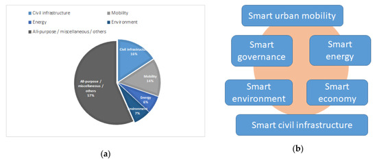 Smart Cities services analyses 2010–2018. Data extracted from the study done in [42]: (a) percentage of appearance in papers; (b) main areas of interest for deploying Smart City services.