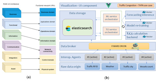 Architecture of the proposed framework: (a) IoT layered reference architecture RAMI4.0 and IIRA—image extracted from [79]; (b) Modules and technologies of the framework. The figures are aligned to reflect the mapping reference layer - component.