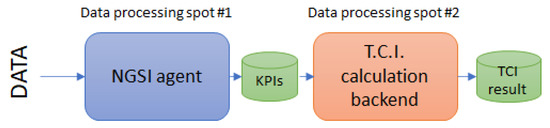 - To process the data and convert it to KPIs: this development will be different for each data source, becoming the most craftsmanship development when a composite indicator tool wishes to be deployed using our framework. It might range from a simple format conversion to a complex data relation, combination, and construction. Additionally, each NGSI agent may have different number of inputs and outputs. Despite the fact that the usual case (see Section 3.4.1) is to realise a 1:1 relation, the framework has been prepared to accept 1:N, N:1 and N:N setups as well.