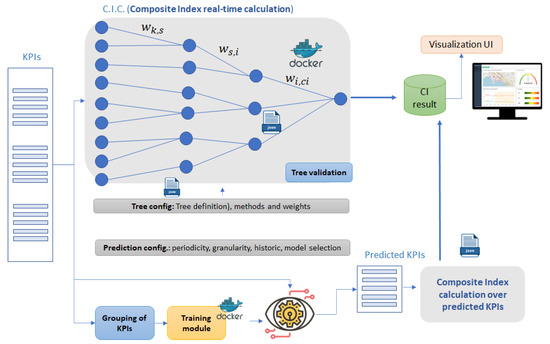 - According to the parameter set in (1), including the scheduling, the periodic calculation of the index. First, the KPI values are properly normalised (crucial step on a CI procedure). Then, starting by the leaf node, a cascading algorithm including aggregation, weighting and combination leads towards a final index value. Technologically, this component has been developed as a dockerised (packaged in a Docker container [101]) standalone Java application.