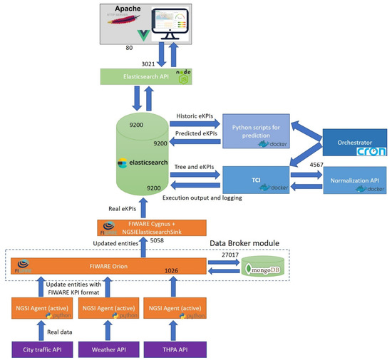 Narrowing down the research scope, another interesting project targeting composite indicators appeared. The CITYkeys project (EU-funded) [65] is focused on discovering and implementing CIs for smart cities. A huge set of actionable indicators were defined in this project, including cyber-security, local food production, healthy lifestyle, ground floor usage, among others; clearly observing the relevant intervening actors, different examples of deployment and thorough descriptions [66]. However, the calculation was mostly based on Likert evaluations, suing very simplistic scorings (e.g., [67]) and static data coming from reporting or literature databases. Although a performance system was proposed [68], the work in CITYkeys was assumed as incomplete for the purpose of this paper. Another implementation analysed by the authors was the “Dashboard thinking cities” promoted by Telefónica using FIWARE commodities in all the procedure [69]. This option was carefully studied considering that: (i) it uses FIWARE Context Broker (ORION) and (ii) other components that were considered to be included in this paper, (iii) it enables a KPI-powered module explicitly designed to create “Key Performance Indicators” (KPIs) for smart cities and (iv) it allows a multi-dimensional multi-service approach built upon open data and open-source technologies. However, it was discarded as there was not found any relevant real application of the concept, seeming for the moment an interesting proposal pending to be validated in practical cases. Besides, it did not consider including options for tailoring the structure of the CI or interacting with prediction options.