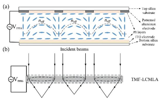 Due to the birefringence characteristics of a nematic LC, an incident light ray is split into two components (the ordinary ray and extraordinary ray) whose polarization directions are orthogonal to each other when it enters. The refractive index of the ordinary ray is independent of the orientation of the incident ray entering. On the contrary, the refractive index of the extraordinary ray is dependent on the angle between the incident ray and the orientation of the optical axis of nematic LC materials, which depends on the LC director orientation []. Therefore, when the LC director is tilted, supposing the orientation of the incident ray is fixed, a variation in the refractive index of the extraordinary ray is formed, forming a lens-like effect. For the TMF-LCMLA, the tilting is attained by use of an electric field. A detailed schematic of the TMF-LCMLA used in the plenoptic camera proposed by us is given in Figure 2.