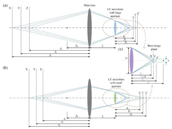 Figure 4 shows a schematic of the digital refocusing range of the proposed plenoptic camera. L presents the distance from the main lens to the LC microlens, B presents the distance from the LC microlens to the sensor plane, and fm is the focal length of the main lens. As shown in Figure 4a,b, lights from points X, Y, and Z are compressed by the main lens and tend to form points X’, Y’, and Z’. However, due to the presence of the LC microlens, they are eventually imaged at the points X”, Y”, and Z”, which is shown in Figure 4c. Cx, Cy, and Cz are the distances from points X”, Y”, and Z” to the LC microlens. Point Y” is just on the best image plane (i.e., the sensor plane) and, thus, Cy is equal to B. X” and Z” are two points before and behind the best image plane, respectively, and the spot sizes are exactly equal to s. In this case, they are considered to be acceptably sharp. According to previous studies, the mathematical relationships are as follows []: