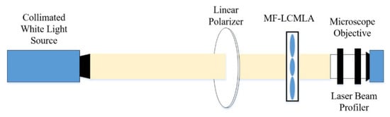 where r is the radius of the lens aperture and N is the number of observed rings. When a voltage signal is applied, the relatively accurate value of focal length is obtained by measuring the sharpest light intensity distribution []. The testing system is demonstrated in Figure 6. A collimated white light source is first polarized by a linear polarizer (USP-50C0.4-38 of OptoSigma, Tokyo, Japan), and then continuously passes through the TMF-LCMLA. The transmission axis of the linear polarizer is parallel to the rubbing direction of the PI layers. Then, the light-fields are remarkably amplified by a microscope objective, and finally captured by a laser beam profiler (WinCamD of DataRay, Inc., Redding, CA, USA). To finely locate the focal planes shaped, we precisely adjust the distance between the TMF-LCMLA and the microscope objective for obtaining the sharpest light intensity distribution of the converged light-fields. The relatively accurate value of focal length is equal to the sum of the thickness of the silica substrate and the distance between the exiting end of the TMF-LCMLA and the incident surface of the microscope.