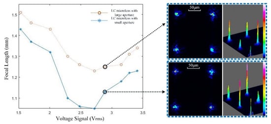 Figure 7 demonstrates the relationship between the focal length of the TMF-LCMLA and the RMS value of the voltage signal applied. The voltage signal is an AC square wave with a frequency of 1 kHz. Figures in the dotted box on the right indicate the 2D and 3D point spread functions (PSFs) of the TMF-LCMLA, respectively, with a voltage signal of ~2.89 Vrms. It is worth mentioning that the LC refractive index cannot be a perfect axisymmetric parabolic-like distribution, and it has dispersion, which results in imaging aberrations such as spherical and chromatic aberrations [,]. The actual full-width at half-maxima (FWHMs) of focal spots shown in Figure 7 are between ~2 and ~3 μm. According to our experiments, the current TMF-LCMLA can work normally in the range from ∼1.5 to ∼3.4 Vrms, and the focal length is in the range from ∼1.05 to ∼1.51 mm, which shows excellent tenability at low voltage and is relatively consistent with the measured interference patterns. With different voltage signals in an appropriate range, the TMF-LCMLA acts as a tunable multifocal array. Moreover, with the same voltage signal applied, the focal length of the LC microlens with large aperture is always larger than that with small aperture, which is consistent with the theory.