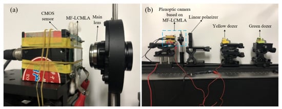 Figure 8b demonstrates the experiment diagram for plenoptic imaging. The yellow dozer and green dozer were placed 240 and 470 mm away from the proposed plenoptic camera, respectively. The linear polarizer (USP-50C0.4-38 of OptoSigma, Tokyo, Japan) between the two dozers and proposed plenoptic camera is used to satisfy the polarization sensitivity of the TMF-LCMLA, thereby eliminating stray-light crosstalk. The transmission axis of the linear polarizer is parallel to the rubbing direction of the PI layers.