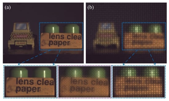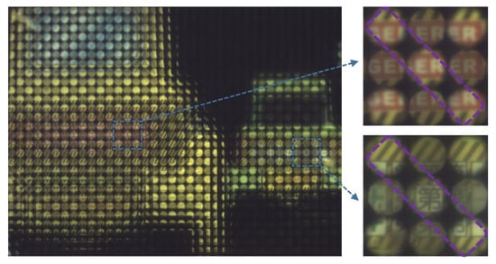 In Figure 14a, a driving voltage signal is not applied over the TMF-LCMLA, so it is not in operation, in which case it is equivalent to a phase retarder. As shown, a 2D image can be obtained clearly, just like conventional cameras. In addition, in Figure 14b, a driving voltage signal of 2.50 Vrms is applied over the TMF-LCMLA; thus, the proposed plenoptic camera is in plenoptic imaging mode. Images in the blue dashed box below are partially enlarged, and the image in the middle purple dashed box below is a partial image obtained after digital refocusing. It can be seen that compared to the image taken by the conventional camera, the 2D image obtained via digital refocusing has the disadvantages of low spatial resolution and poor contrast, which indicates that the traditional 2D imaging mode still has important value in the field of imaging. Moreover, stray-light crosstalk is introduced due to the high transparency of ITO (compared to Al-patterned electrode), which is also a reason for the contrast reduction.