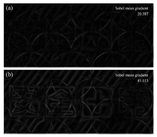 For these two sets of images with different noise characteristics, different methods are used to objectively and quantitatively evaluate the image quality, thereby demonstrating a wider range of digital refocusing. An image quality evaluation algorithm named BISHARP is used to evaluate the two refocused images of the yellow dozer. The BISHARP algorithm is a fast no-reference image sharpness/blurriness assessment model that operates in the spatial and transform domain []. It generates local contrast image maps by computing the root-mean-squared values for each image pixel within a defined local neighborhood size, thus estimating the sharpness of the image. The lower the score of the input image, the sharper it is. Scores of two refocused images of the yellow dozer in Figure 10 are 1.917 and 2.632 corresponding to LC microlenses with small apertures and large apertures. This means that the refocused yellow car by LC microlenses with small aperture is sharper, which is consistent with objective theory and subjective observation. Due to obvious overlapping shadow noises, Sobel edge detection is selected to detect the edge information of the two refocused green dozer images []. The Sobel operator is a first-order discrete difference operator that can not only obtain a relatively good detection effect, but also has a smooth suppression effect on noise. It contains two 3 × 3 matrices, which are used to perform the plane convolution operation with the measured image, to obtain the approximate brightness difference in both horizontal and vertical directions. Generally, the sharper image has a faster gray variation at the image edge. The edge images obtained after the operation of the Sobel operator are shown in Figure 11. In Figure 11a, apart from noise, almost no texture features of Chinese characters and lines can be seen, and the texture features of Chinese characters and lines can be clearly seen in Figure 11b. Sobel mean gradients of Figure 11a,b are 20.387 and 41.513, respectively, which means that the refocused green dozer by LC microlenses with large aperture is relatively sharper []. Similarly, it is consistent with objective theory and subjective observation.