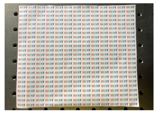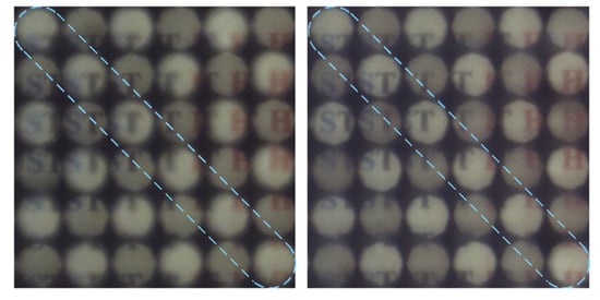 Moreover, due to the excellent tunability of the TMF-LCMLA, the digital refocusing range of the proposed plenoptic camera can be shifted electrically. A target is shown in Figure 12. On the left and right sides of Figure 13 are partially captured light-field images of the target at a distance of 200 mm with applied voltage signals of ~2.20 Vrms and ~2.75 Vrms, respectively.